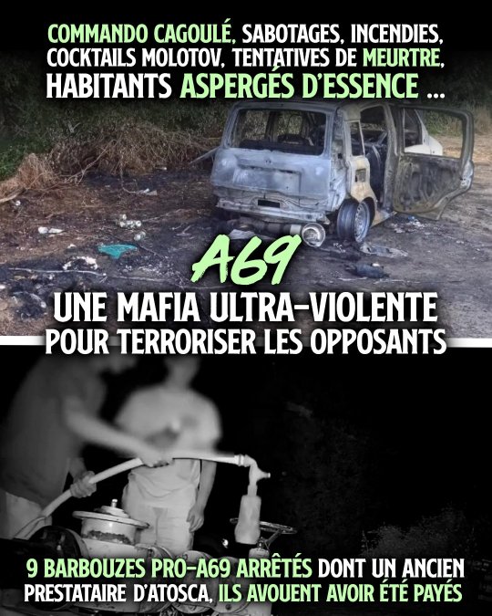 ❦ 10 octobre 2025 - « Des hommes payés pour incendier des ZAD anti-A69 : un ancien prestataire d’Atosca et huit complices arrêtés » : La Dépêche - « A69 : une mafia ultra-violente pour terroriser les opposant·es » : Contre-Attaque