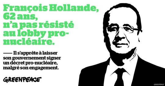Illustration : campagne de Greenpeace « Programmation pluriannuelle de l’énergie: M Hollande ce projet de décret est non compatible !! » rapport du cabinet Arnaud Gossement : PPE