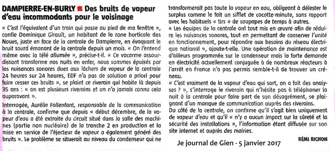 🚨 « Dampierre-en-Burly (45) : des lâchers de vapeur à la centrale nucléaire ont indisposé les riverains » : 7 janvier 2017 - France 3